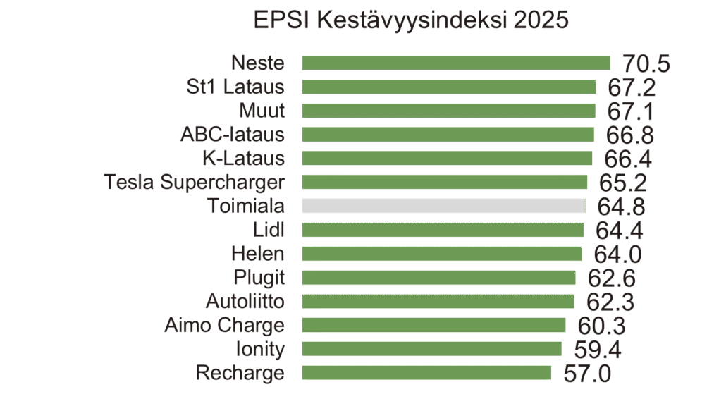 Kärkipaikan kestävyysvertailussa ottaa Neste MY Uusiutuva Lataus, jonka kestävyysindeksi 70,5 (+6,3) on selvästi sekä toimialan että koko EPSI Rating -järjestelmän keskiarvoa korkeampi.