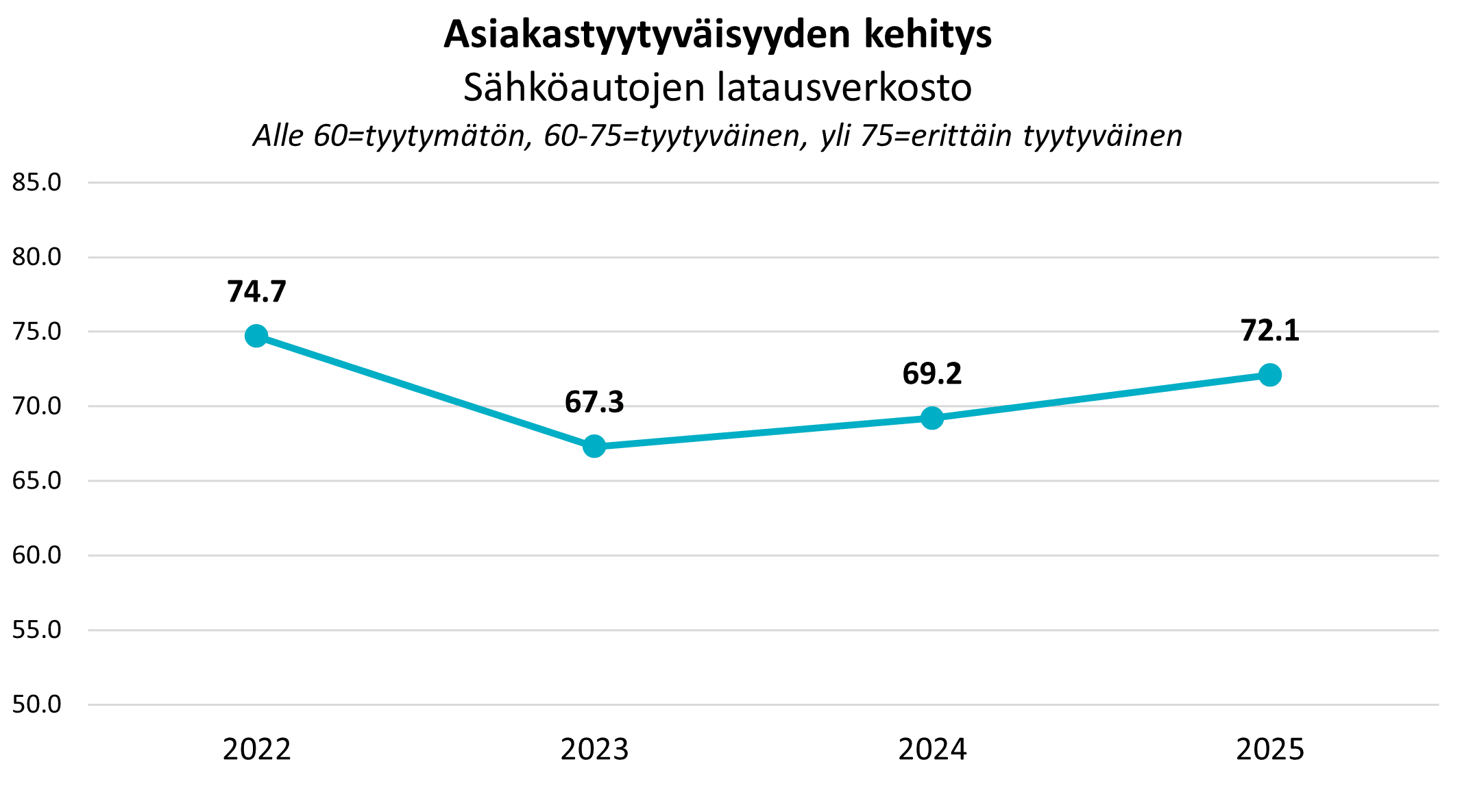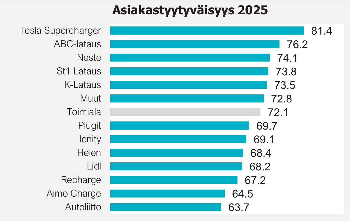 Keskimääräinen toimialan asiakastyytyväisyysindeksi on noussut 72,1 pisteeseen (+2,9 vuoteen 2024 verrattuna), mikä kertoo siitä, että latauspalvelujen kehitys alkaa vastata sähköautoilijoiden arjen tarpeisiin.