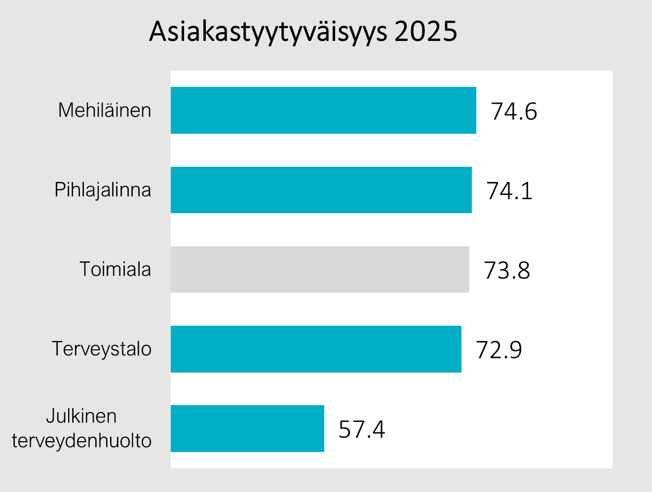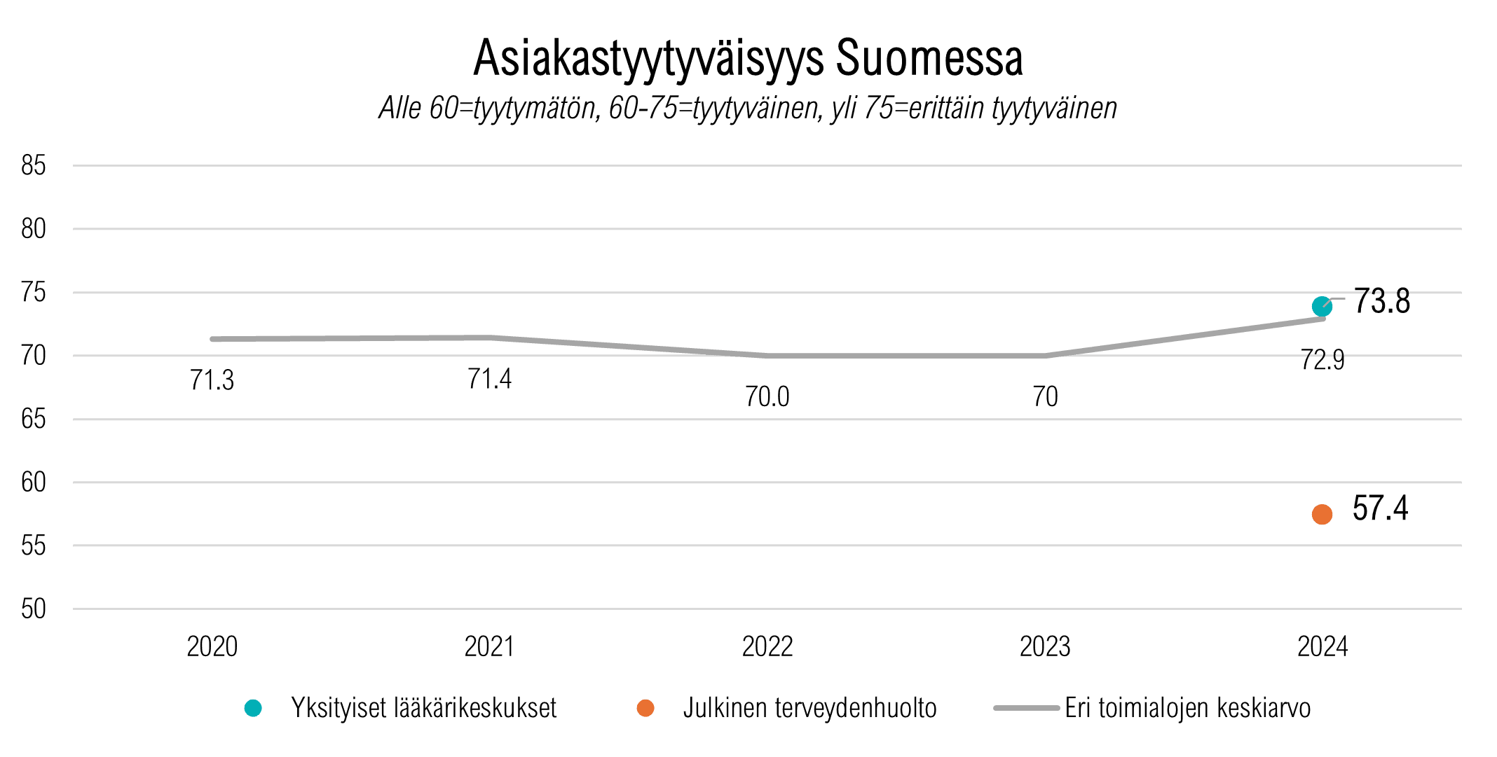 Yksityiset lääkärikeskukset 2025. Asiakkastyytyväisyysindeksi antaa arvon välillä 0 ja 100. Indeksi yli 75 on erittäin hyvä, kun taas arvo alle 60 osoittaa asiakkaiden suurta tyytymättömyyttä.